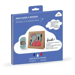 Box mit all den notwendigen, um seine Leinwand zu erstellen: ein gedruckter Rahmen, 5 Farben aus Wolle, 1 Nadel, 1 Einstellung, eine Mitteilungskollaboration mit 2 auf dem Gebiet von Kurzwolle und Wolle erkannten Marken: Bergère de France, der ein großer Spieler auf dem Gebiet des Strickfadens und Bohin, der der letzte Hersteller in Frankreich von Nähnadeln ist.