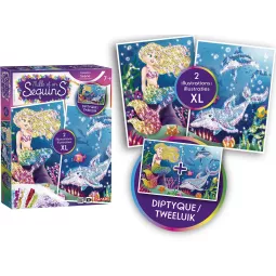 Troverete in questo kit due immagini pre-stampate di un arredamento di sirena che servono come telaio e base per allegare paillettes usando piccoli perni. La posizione di ogni paillettes è stampata sull'immagine, in modo da poterli posizionarle facilmente per scintillare il tuo illustrazione!